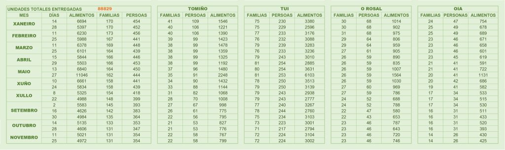 Foron entregadas 12.852 unidades de alimentos, distribuídos como sigue, nos concellos que prestamos axuda: