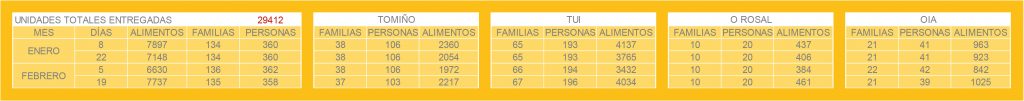 Las entregas de alimentos se realizan los sábados día 5 y 19 respectivamente. Durante el mes de febrero del año en curso, se han atendido a 362 personas, que forman parte de 136 unidades familiares.
