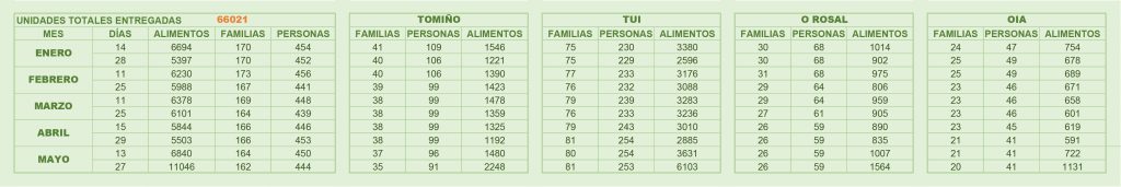 As entregas de alimentos fanse os sábados día 13 e 27 respectivamente. Durante o mes de maio do ano en curso, atendéronse a 444 persoas, que forman parte de 162 unidades familiares.