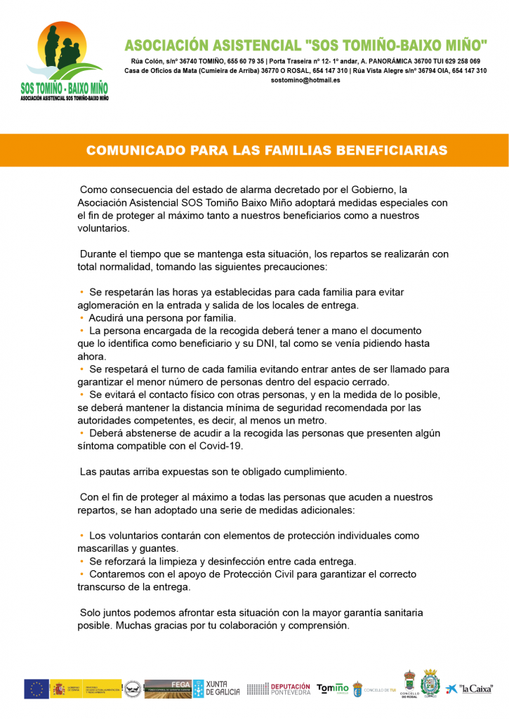 Comunicado para las familias beneficiarias Públicado en 17 marzo 202010 abril 2020 por sostomino Como consecuencia del estado de alarma decretado por el Gobierno, la Asociación Asistencial SOS Tomiño Baixo Miño adoptará medidas especiales con el fin de proteger al máximo tanto a nuestros beneficiarios como a nuestros voluntarios. COMUNICADO FAMILIASDescarga