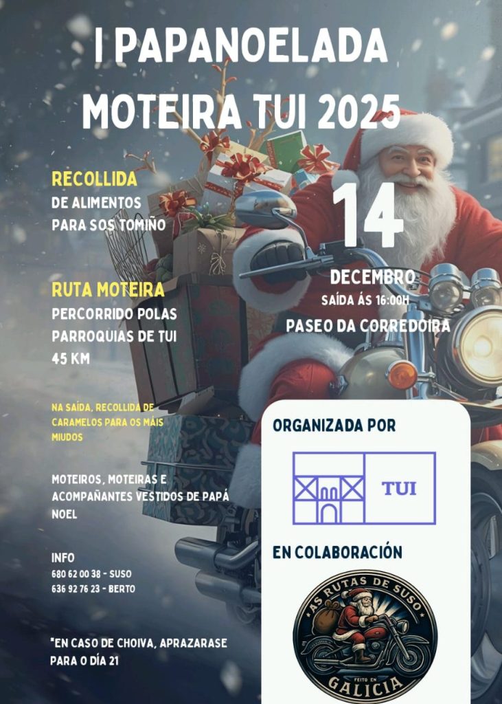 O espírito do Nadal regresa con forza ás rúas de Tui coa I Papanoelada Moteira, un evento solidario e festivo que encherá as aldeas de alegría, motor e moita ilusión. Unha cita aberta a todas as persoas afeccionadas ás motos, e tamén ás que non o son.
